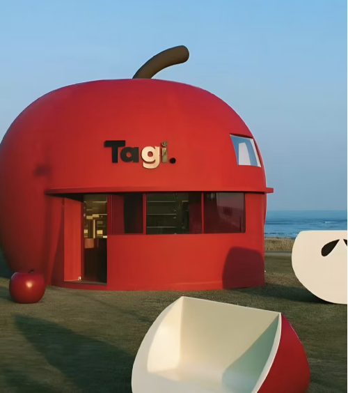 在线下空间打造方面,Tagi.坚持着“一店一设计”的原则。例如,在阿那亚,Tagi.曾搭建了一座超现实的“红苹果屋”;而在其他地方,Tagi.也巧妙地将品牌符号与在地文化元素巧妙融合。这些适合拍照的线下空间,也成为年轻人的热门打卡地,帮助Tagi.进行引流。