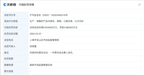 2025年4月7日,上海市宝山区市场监督管理局对上海塔闻贸易有限公司做出行政处罚,处罚事由为“生产、销售的产品中掺杂、掺假,以假充真,以次充好”,没收违法所得0.65万元,罚款超3.88万元。