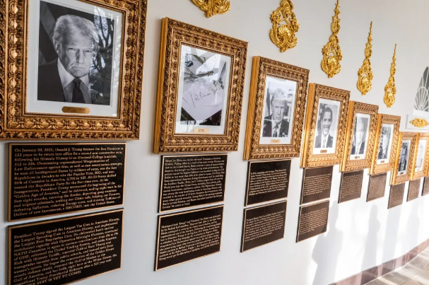记录特朗普首个任期的铭牌则写道,他在任内“签署了史上最大规模减税法案、创造了繁荣经济、破纪录地废除联邦法规、重建美军、退出伊核协议与《巴黎气候协定》、终结《北美自由贸易协定》的灾难、摧毁‘伊斯兰国’、签署历史性《亚伯拉罕协议》、打造了世界史上最伟大的经济体”。